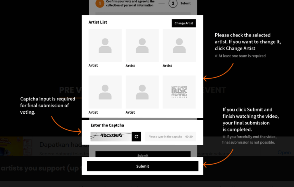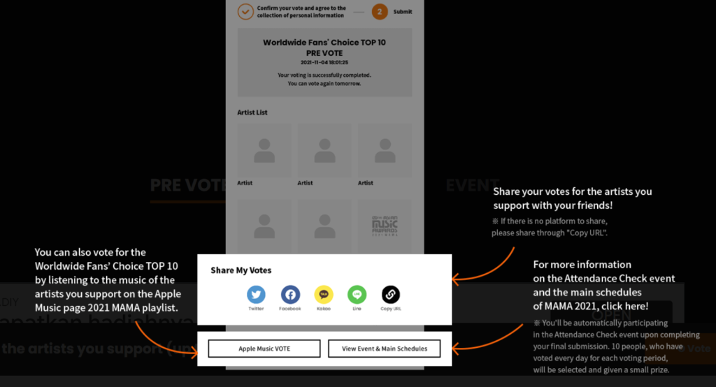 - Only tweets with both the official hashtag for 2021 MAMA Twitter voting (#MAMAVOTE) and the artist’s official voting hashtag listed under the Worldwide Fans’ Choice TOP 10 nominees’ photos on the 2021 MAMA official website will count as valid votes (#MAMAVOTE #artisthashtag).