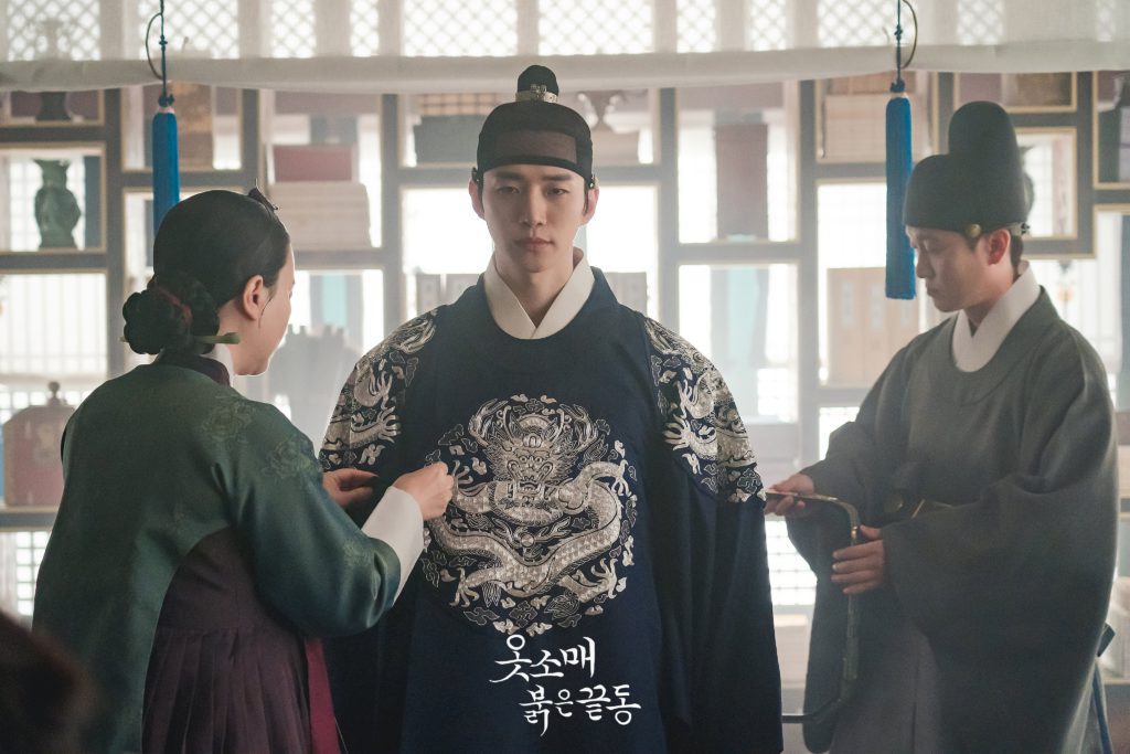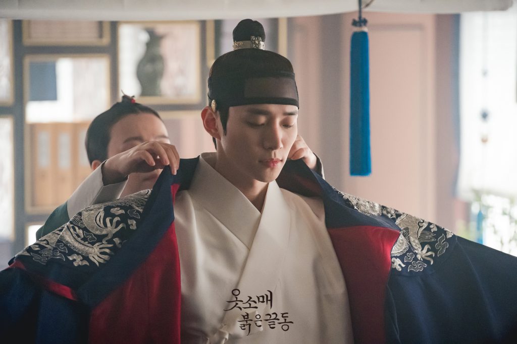 The first still cut images of “The Red Sleeve Cuff” drama showed 2PM Junho in the process of wearing a blue Gonryongpo, a Korean royal robe for the crown prince. On his sides, a eunuch and a court lady were seen helping him fixing his robe.
