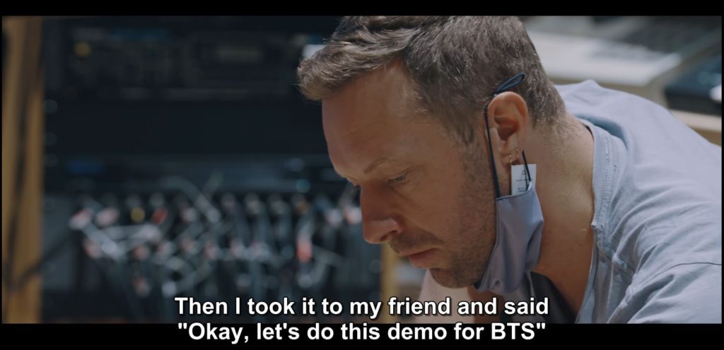 In the BTS x Coldplay “My Universe” behind-the-scenes documentary, Chris Martin mentioned that he’d taken “My Universe” to his friend and said, “Let’s do this demo for BTS!”.