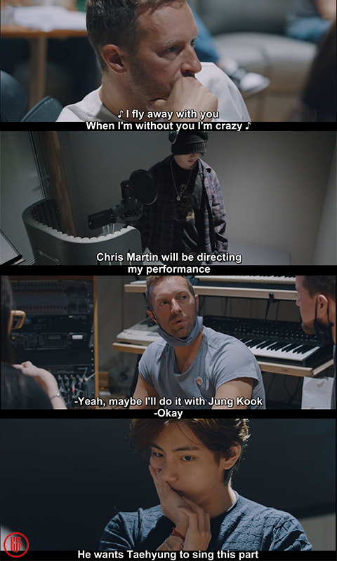 Once the creation process was finished, Chris Martin flew to Korea, met with BTS, and directed the recording and performance as BTS director for the day. He divided the parts and specially chose BTS Jungkook and V to sing the Korean parts. Furthermore, as if he had truly understood BTS vocal constructions, Chris Martin then personally asked Jimin to showcase his high vocal range.
