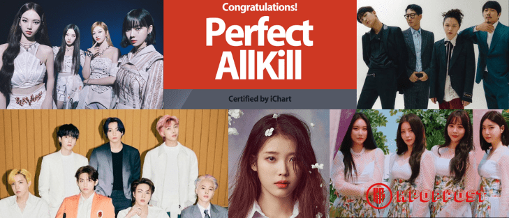 A certified all-kill is for the songs that successfully reach the top of the Daily Top 100 and 24Hits charts of Melon, Top 100 (Daily) and Top 100 (Realtime) charts of Genie, Song chart Daily and Realtime of Bugs, VIBE’s daily chart, and the Realtime charts of FLO and iChart. In addition, a Perfect All-Kill requires topping iChart’s weekly chart as well.