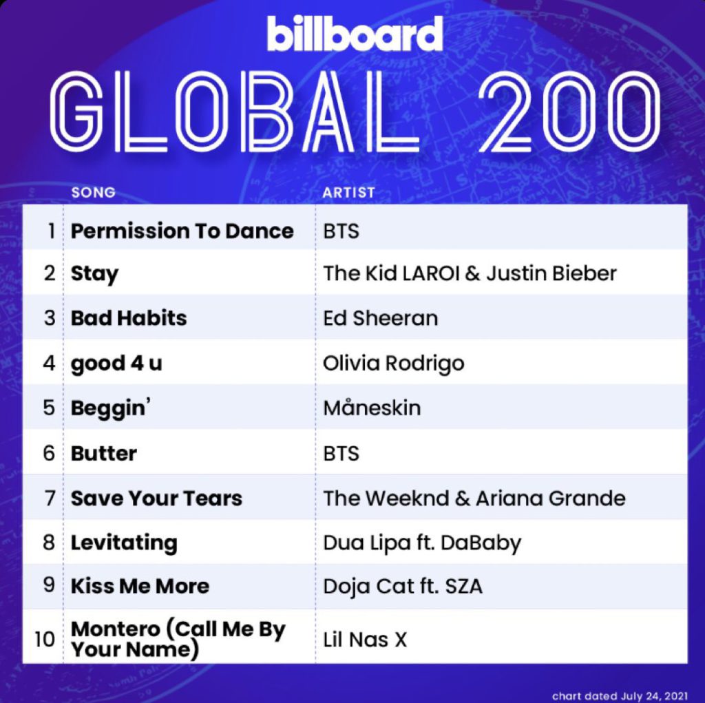 Besides, Billboard Hot 100 chart, BTS’ “Permission to Dance” also enters at No. 1 on the Billboard Global 200. After being released on July 9, the song has 170.8 million streams and 138,600 sales worldwide in the July 9-15 tracking week.