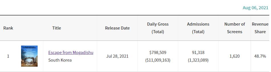 According to the Korean Film Council, Korean movie “Escape from Mogadishu” which premiered on July 28, 2021, hits No.1 the Box Office in South Korea. Moreover, it’s already has a total daily gross of $11,009,163, total admissions of 1,323,089, number of screens 1,620, and a revenue share of 48,7% per August 6, 2021.
