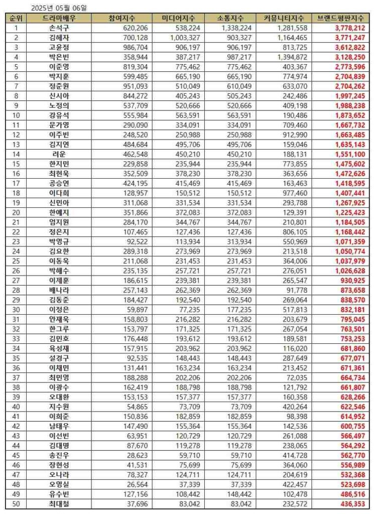 The Korean Business Research Institute analyzed 65,497,088 brand big data points from 50 actors appearing in dramas from April 6 to May 6, 2025. Compared to 59,850,135 drama actor brand big data from April, it increased by 9.44 percent. Using the latest brand big data, the institute conducted a consumer behavior analysis to determine the brand reputation indexes for actors and dramas.