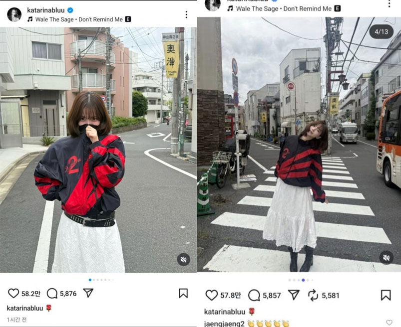 On May 27, 2025, Karina of aespa uploaded a series of photos on her personal Instagram. She looked playful and relaxed, strolling through the streets of Tokyo, dressed in a red-and-black windbreaker with the number “2” splashed boldly across the front with a simple rose emoji in the caption.