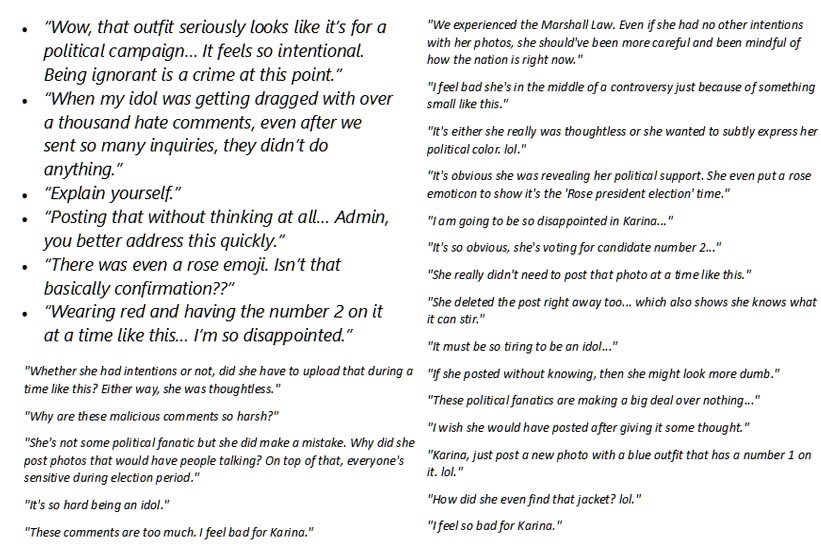 Also, we ask for understanding so that Karina’s original intentions are not misunderstood or taken out of context. We remain committed to supporting and protecting our artists.”