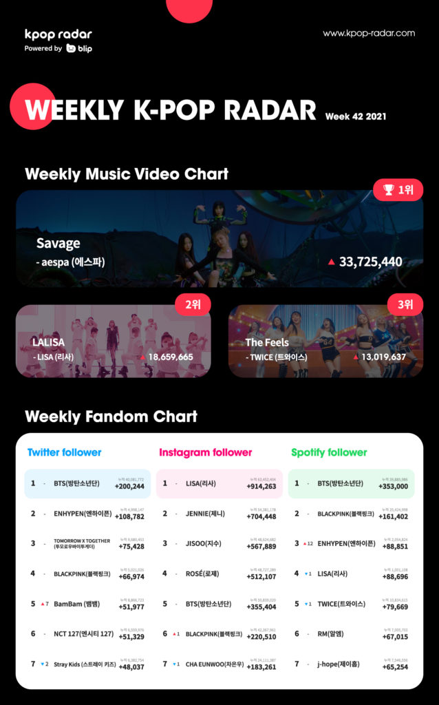 aespa ‘Savage’ music video again peaked last week with 33.72 million views during the 42nd week of K-pop Radar (October 10 to October 16).