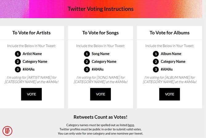 First, if you choose to vote via Twitter, you need to type the name of the song/artist exactly like the required format listed on the website. You may also Retweet and Quote since the AMAs also counted both as 1 vote.