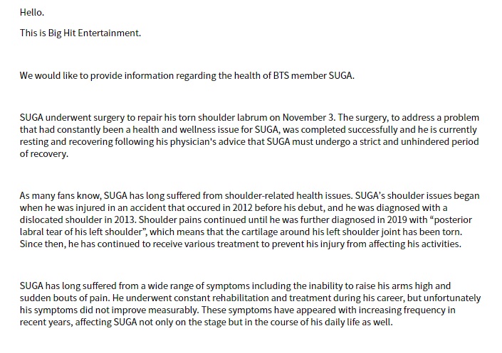 Through the statement, Big Hit announced that Suga had shoulder surgery on November 2. “The surgery to address a problem that had constantly been a health and wellness issue for Suga was completed successfully, and he is currently resting and recovering following his physician’s advice that Suga must undergo a strict and unhindered period of recovery,” the agency wrote.