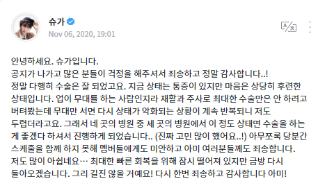 On Weverse, Suga also wrote a message for ARMYs regarding his condition after the surgery.