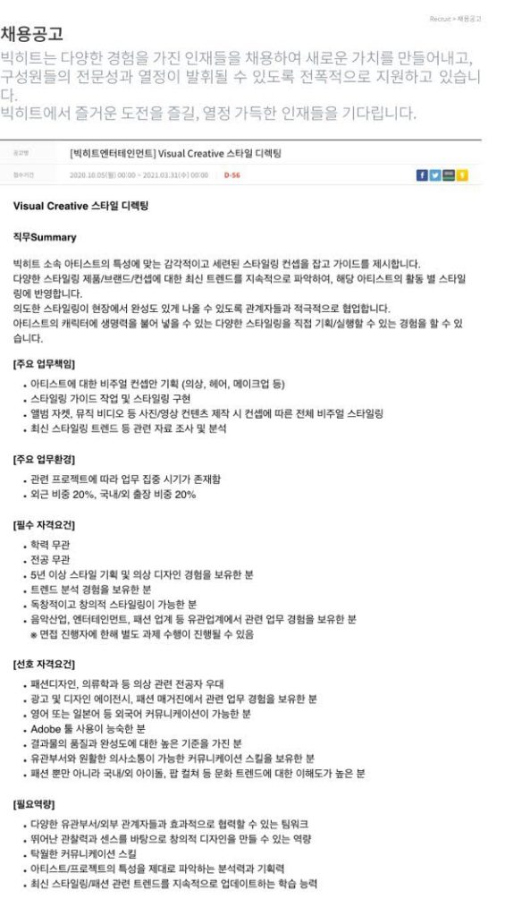 “We are looking for someone that can present and guide a concept that fits the Big Hit artists’ sense of style and trend. They need to be able to understand and catch the latest trends of various products/brands/concepts and use that to style the artists during promotions. They need to be able to communicate well with brands and staff to bring the best styling on set. They also need to be able to create different styles to match the artists’ character and bring them to life.”