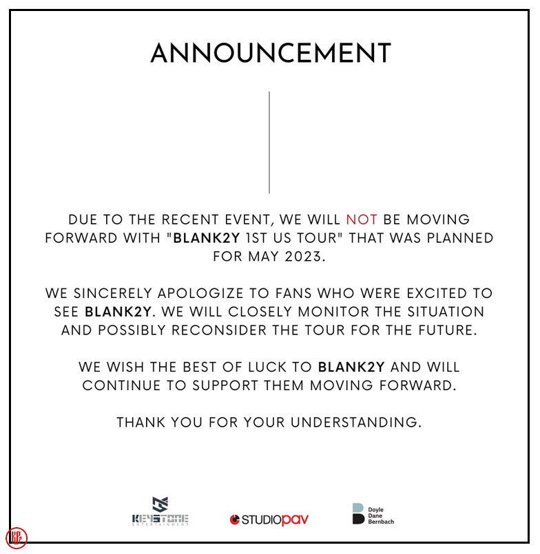 “Due to recent event, we will not move forward with “BLANK2Y 1ST US TOUR” that was originally planned for May 2023.”