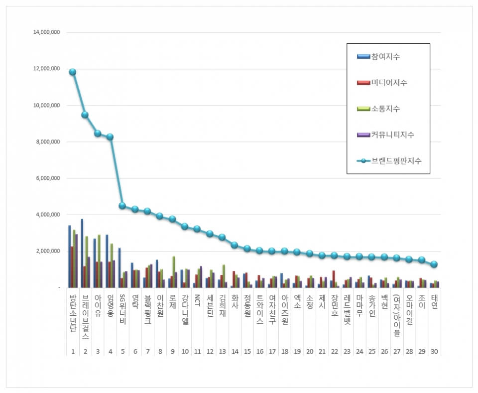 Although it fell by 6.09% from last month, BTS is still leading with Brand Reputation Index 11,813,702, followed by Brave Girls with Brand Reputation Index of 9,469,573 at number 2 for the second months. Then IU rose back to third spot Brand Reputation Index of 8,446,827.
