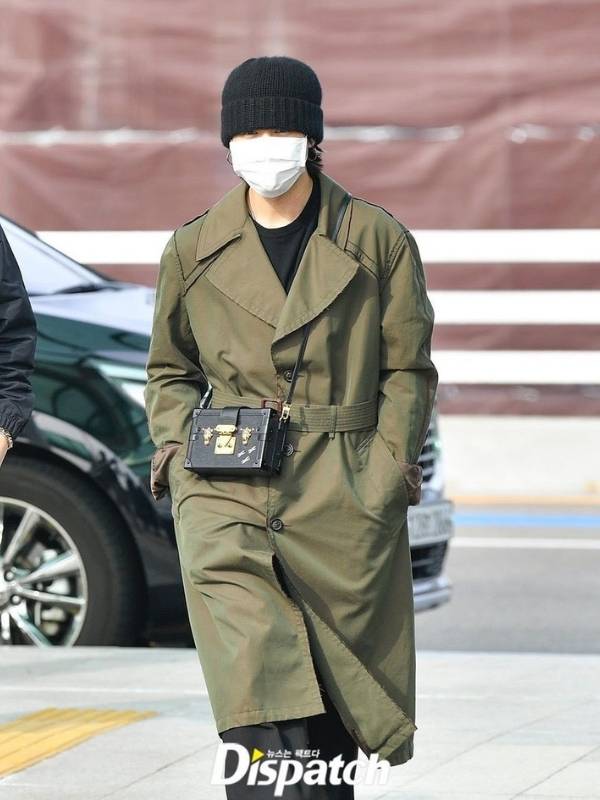 With Leather Trench Coat and black beanie, our sweet Jimin nailed the ‘BTS Goes to LA Airport Fashion.’ He finished off the look with his Louis Vuitton Petite Malle.