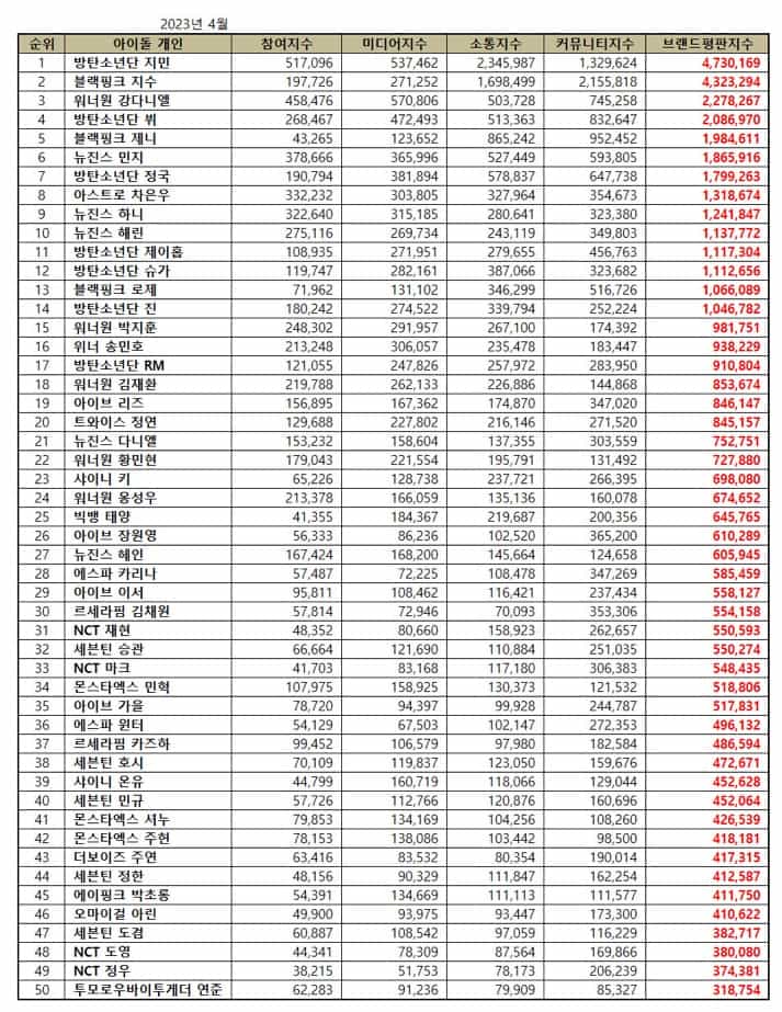 According to the Korean Business Research Institute, Jimin from BTS maintained his position as the most popular individual Kpop idol brand this month. Below are the top 50 individual Kpop idol brand reputation rankings for April 2023.