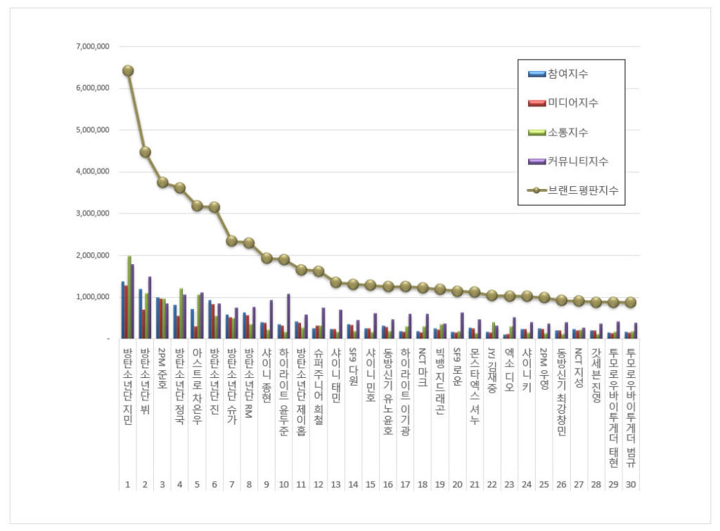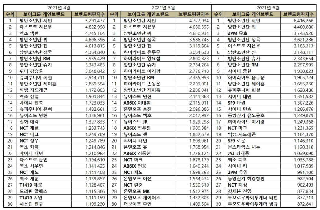 For the analysis, the institute has collected 91.756.256 big data of 632 Kpop boy group members from May 19 to June 19, 2021. Moreover, compared to the 126.052.609 brand big data of Kpop boy group individual in May, it decreased by 27.21 percent.