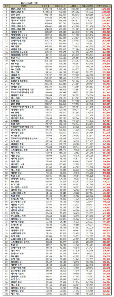TOP 100 KPop Boy Group Member Popularity and Brand Reputation Rankings in June 2021