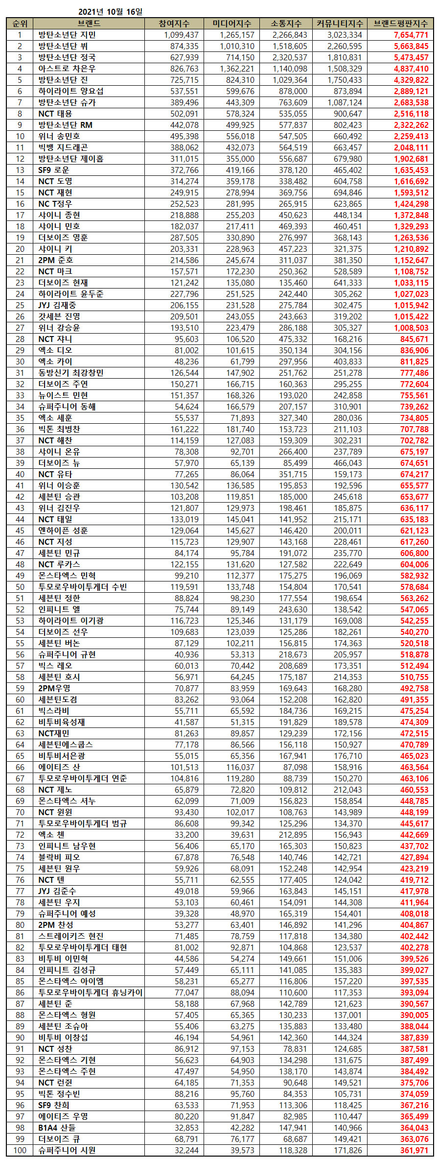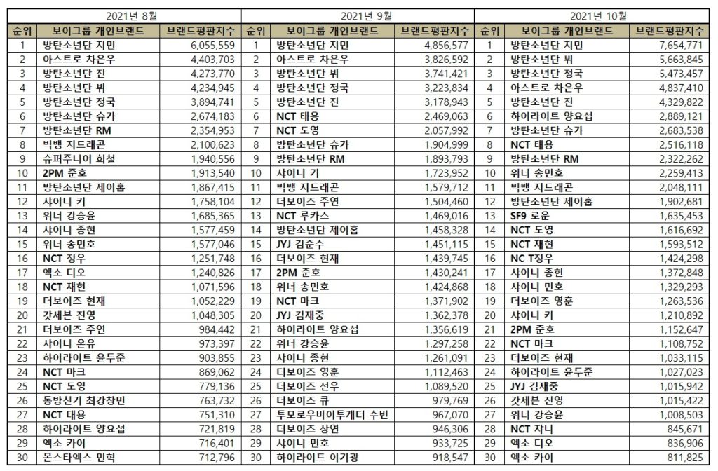 The Korean Business Research Institute has collected 101,091,438 big data of 687 individual boy group members from September 16, 2021, to October 16, 2021. Compared to the 93,818,968 big data of the individual Kpop boy group members in September, it increased by 7.75 percent.
