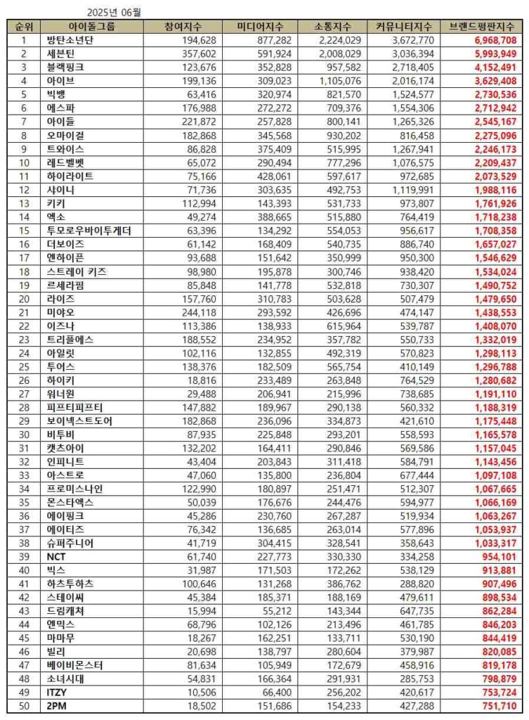The Korean Business Research Institute analyzed 84,049,295 pieces of K-pop idol group brand big data from May 19 to June 19, 2025—a 6.58% increase from the 78,857,284 idol group brand big data in May.