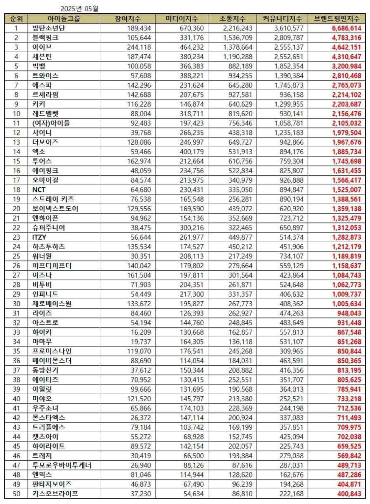 The Korean Business Research Institute has announced the latest brand reputation rankings for Kpop idol groups, with BTS, BLACKPINK, IVE, SEVENTEEN, and BIGBANG dominating the list. Discover the top 50 Kpop idol group brand reputation rankings for May 2025 below.