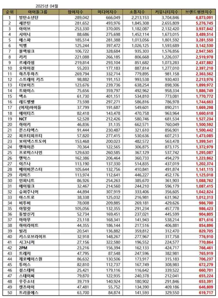 Check out the top 50 Kpop idol group brand reputation rankings for April 2025 below.