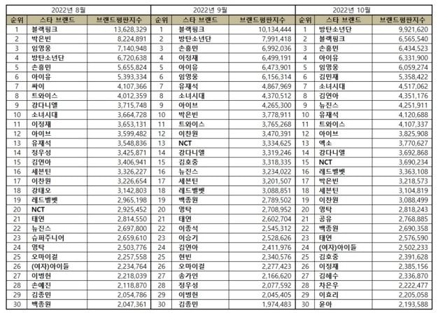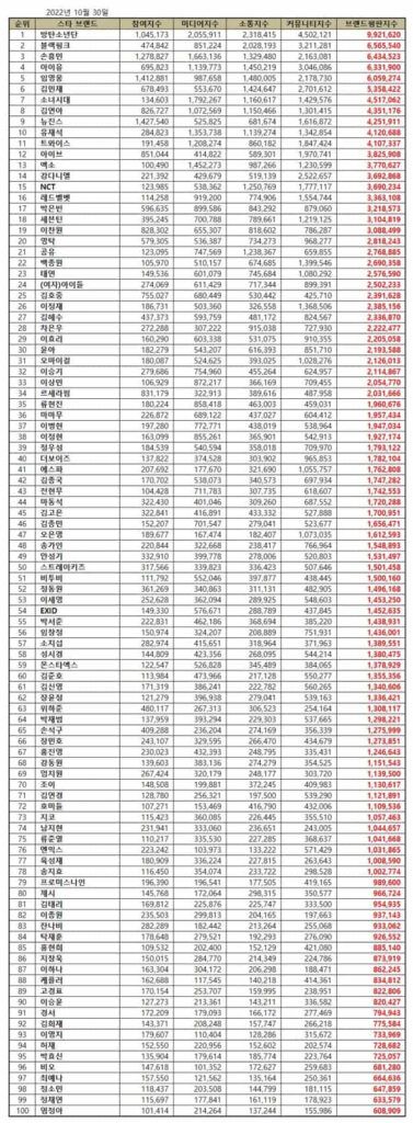 Top 100 Korean Star Brand Reputation Rankings in October 2022