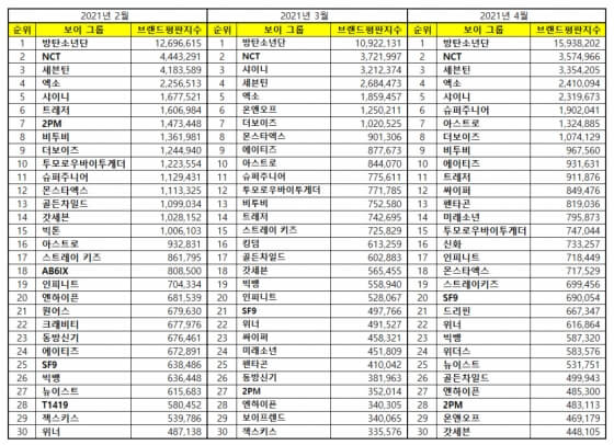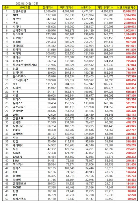 For the analysis, there were 51,474,174 big brand data of the Kpop boy group collected from March 10, 2021, to April 10, 2021. Moreover, compared to March brand big data of 42,275,234, it increased by 21.76%.