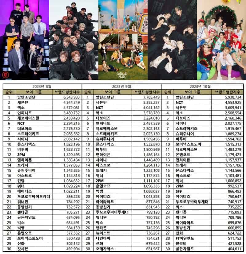 As a result, BTS, NCT, SEVENTEEN, EXO, and THE BOYZ continued to dominate the top five positions as the most popular Kpop boy groups in October 2023.