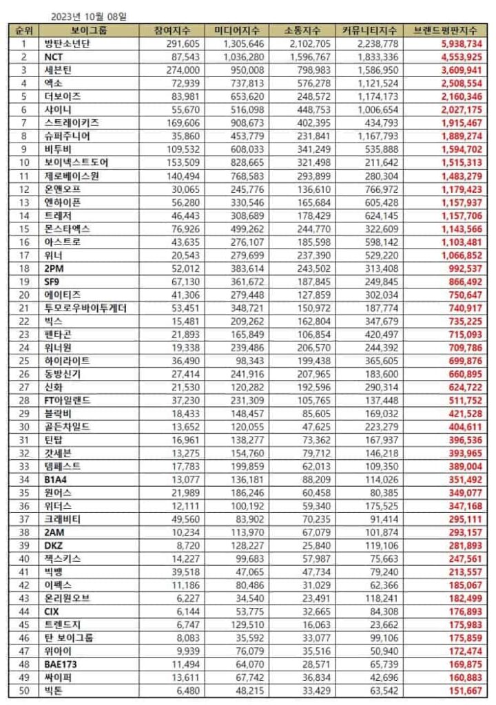 The Korean Business Research Institute analyzed consumer behavior from September 8 to October 8, 2023. They assessed 49,949,476 data points across participation, media, communication, and community indices for boy groups. Compared to September, the data decreased by 18.89% from 61,583,919 brand data.