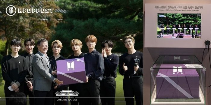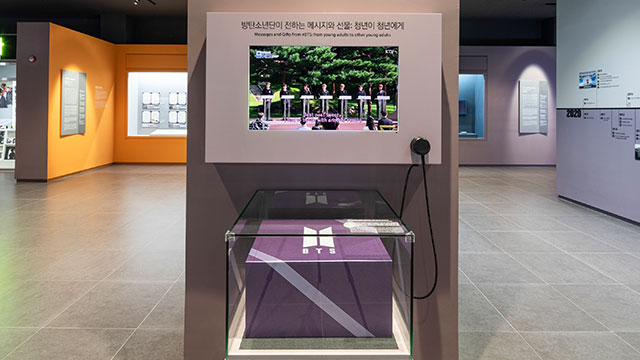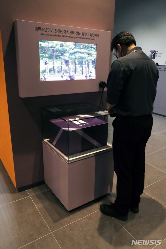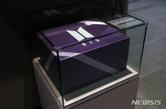 The purple box measures 40-centimeter-long, 30-centimeter-wide, and 26-centimeter-deep and has a white BTS logo on the top. It is kept safely in a big glass box and on display in the fifth-floor permanent exhibition hall at the museum.