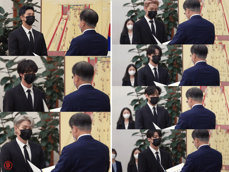 After that, the South Korean President presented a diplomatic passport, a certificate of appointment, and a fountain pen for each BTS member.