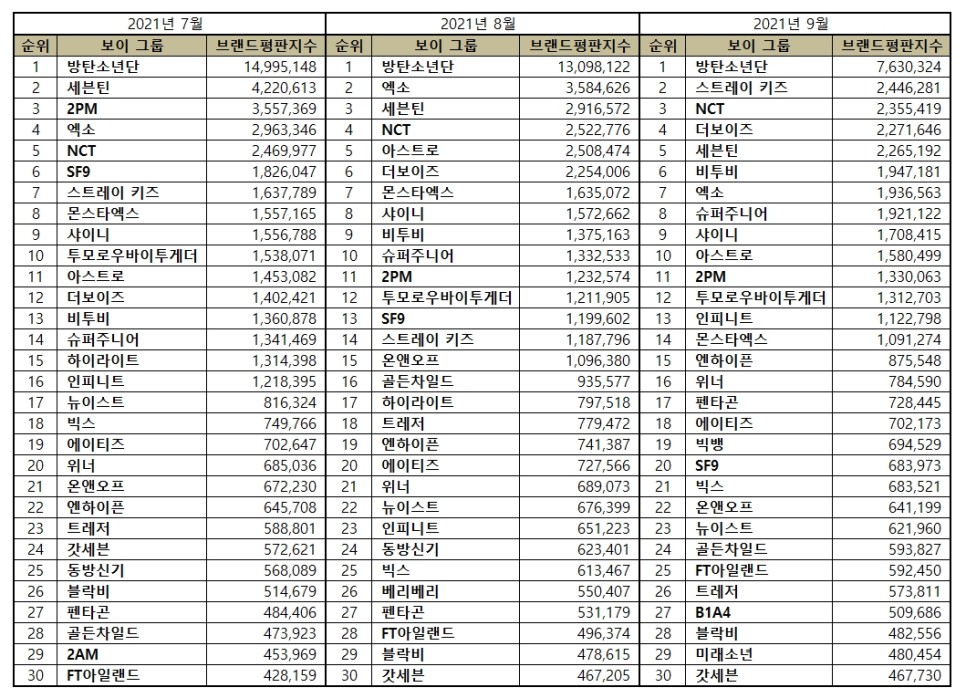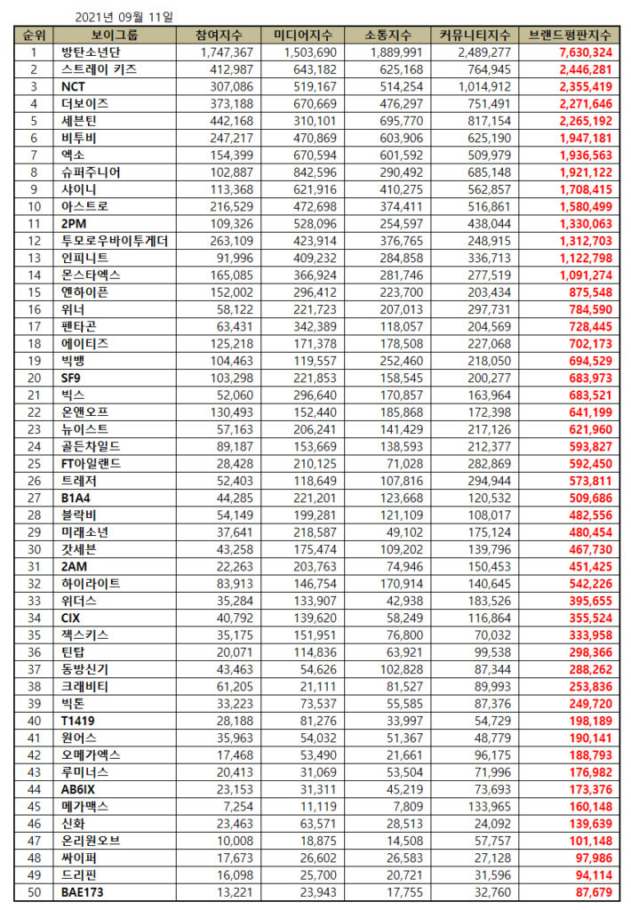 The Korea Institute of Corporate Reputation has gathered 45,813,099 big data of the K-pop boy group brands from August 11, 2021, to September 11, 2021. Compared to the 57,652,745 brand big data of K-pop boy group brands in August, it decreased by 14.67 percent.