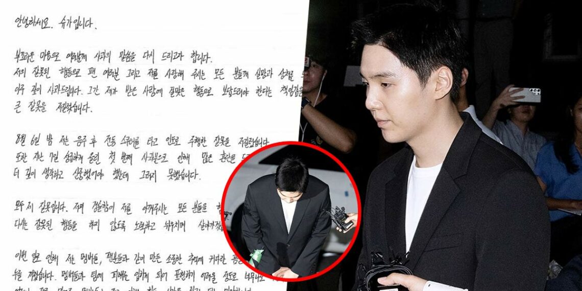 As the growing controversy following his initial police investigation on the DUI incident case, BTS Suga has finally expressed his deepest remorse in a handwritten apology letter. With this lengthy apology, will BTS Suga finally be able to appease the public regarding the DUI drunk driving scandal controversy? And what did BTS Suga actually say in his letter? Let’s delve into the complete discussion in the following report.