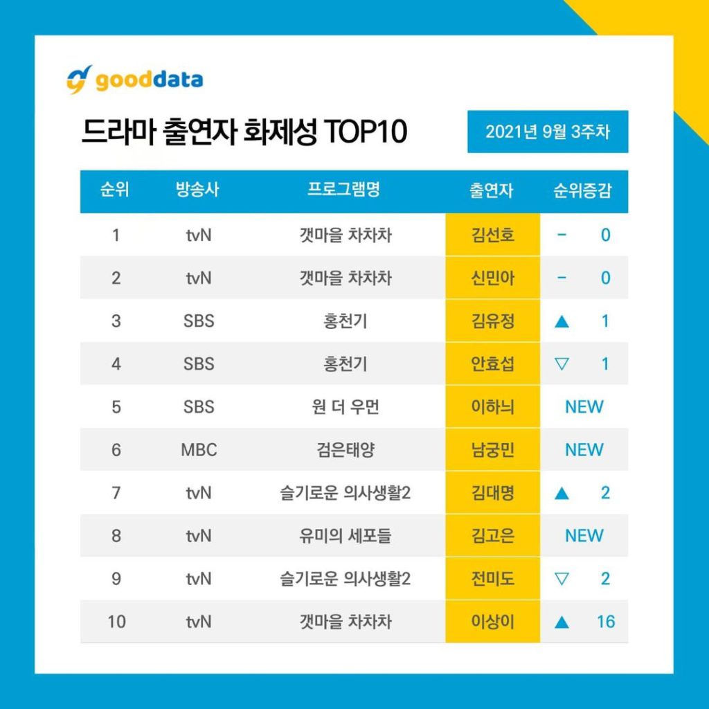 tvN’s “Hometown Cha-Cha-Cha”— came in No. 2 on the list of most buzzworthy dramas along with its cast members ‘the dimple couple’ Kim Seon Ho and Shin Min Ah stayed strong on their spots at No. 1 and No. 2 respectively, while Lee Sang Yi came into No.10 this week most buzzworthy actors.