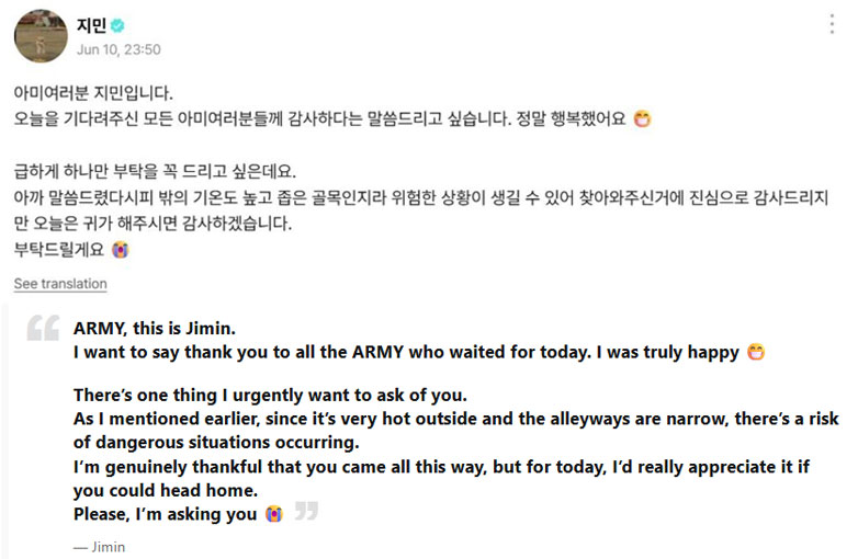 Then, eventually later that day, Jimin posted directly on Weverse: