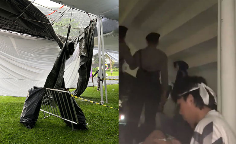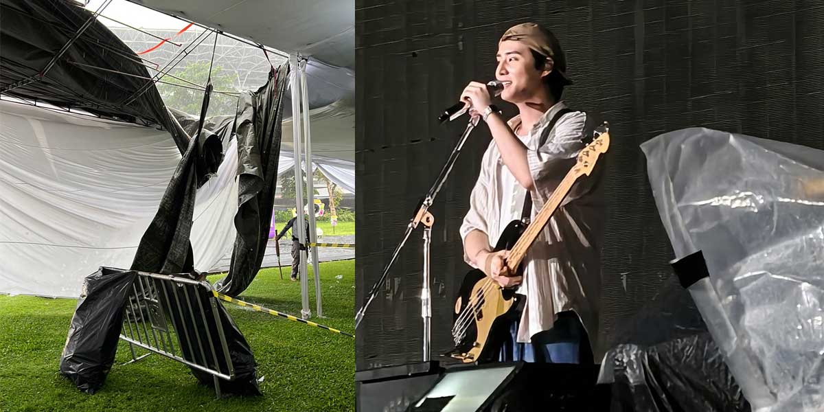 On the day of the show, torrential rain and violent winds swept through the venue hours before DAY6 took the stage. Hundreds of fans were already in line, many waiting for soundcheck entry or general admission. The only available shelter was a set of temporary tents and tarp structures that quickly began to collapse under the weight of accumulated rainwater.