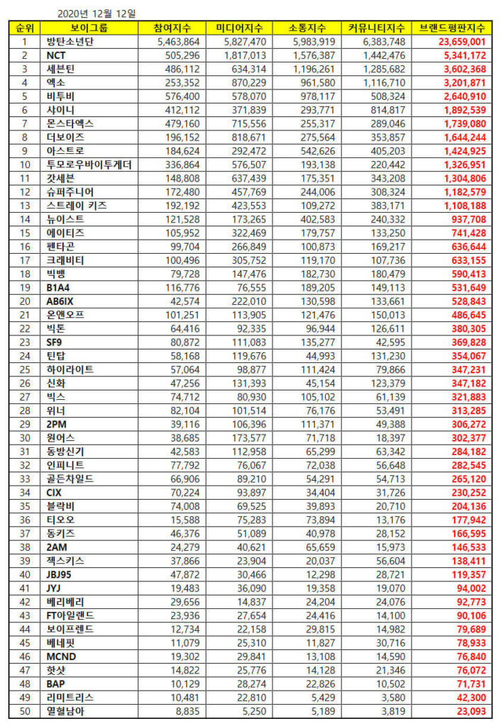 The Korean Business Research Institute has published the Top 50 KPop Boy Group Popularity and Brand Reputation Rankings for December 2020.