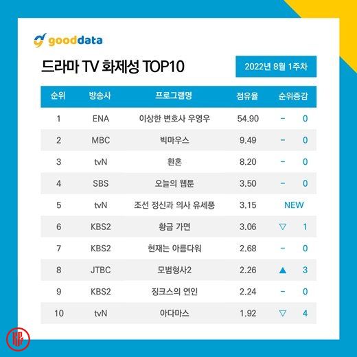 According to Good Data, the ENA channel’s Wednesday-Thursday drama “Extraordinary Attorney Woo” Young-woo’ ranked first on the list of most buzzworthy Korean dramas for six weeks.