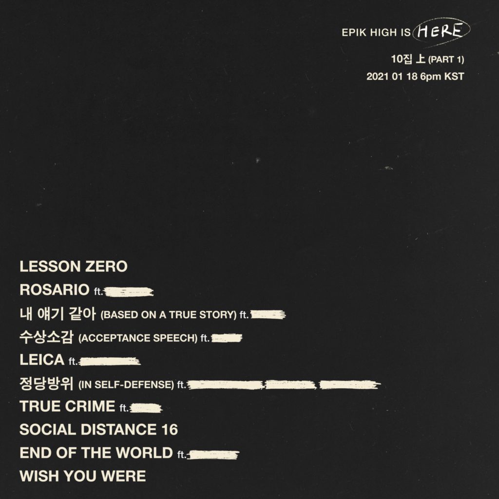 Since the beginning of the tracklist release, Epik High has revealed that there would be several Kpop stars featuring in their upcoming album. Here is the Epik High Is Here Part 1 tracklist: