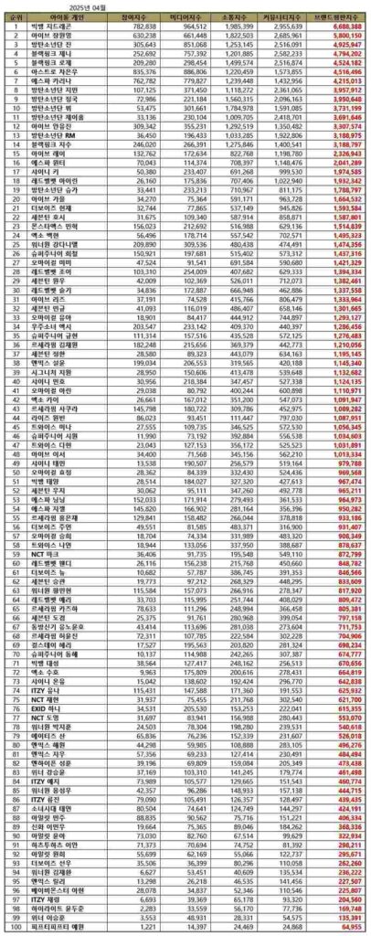 From March 23 to April 23, the Korean Business Institute extracted 138,897,886 pieces of brand big data related to 1,730 individual Kpop idol brands. Compared to 150,404,487 pieces of brand big data on individual Kpop idol brands in March, the number decreased by 7.65 percent.