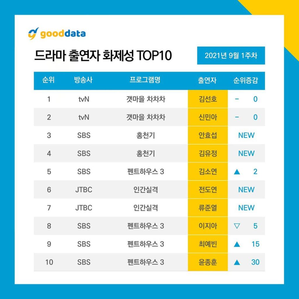 On September 7, Good Data Corporation has revealed the weekly top 10 most buzzworthy Korean drama and actor rankings for the 1st week of September 2021. As a result, SBS “Penthouse: War in Life 3” and tvN’s drama “Hometown Cha Cha Cha” cast members, Kim Seon Ho and Shin Min Ah, top the most talked-about Korean drama and actor list.