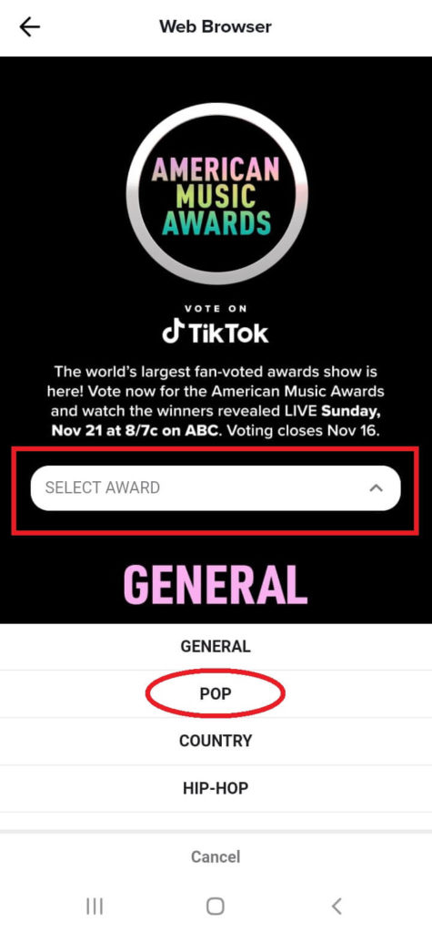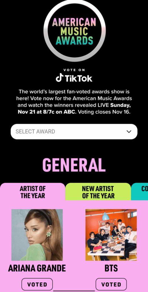 - You will now face the “GENERAL” page of the voting screen, and you can vote for your favorite artists under “Artist of the Year”, “New Artist of the Year”, etc.
