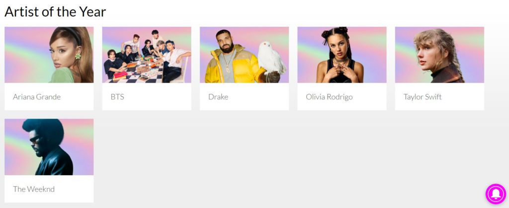 The first category in which BTS is nominated is the “Artist of the Year”. The supergroup will be head to head against Ariana Grande, Drake, Olivia Rodrigo, Taylor Swift, and The Weekend.
