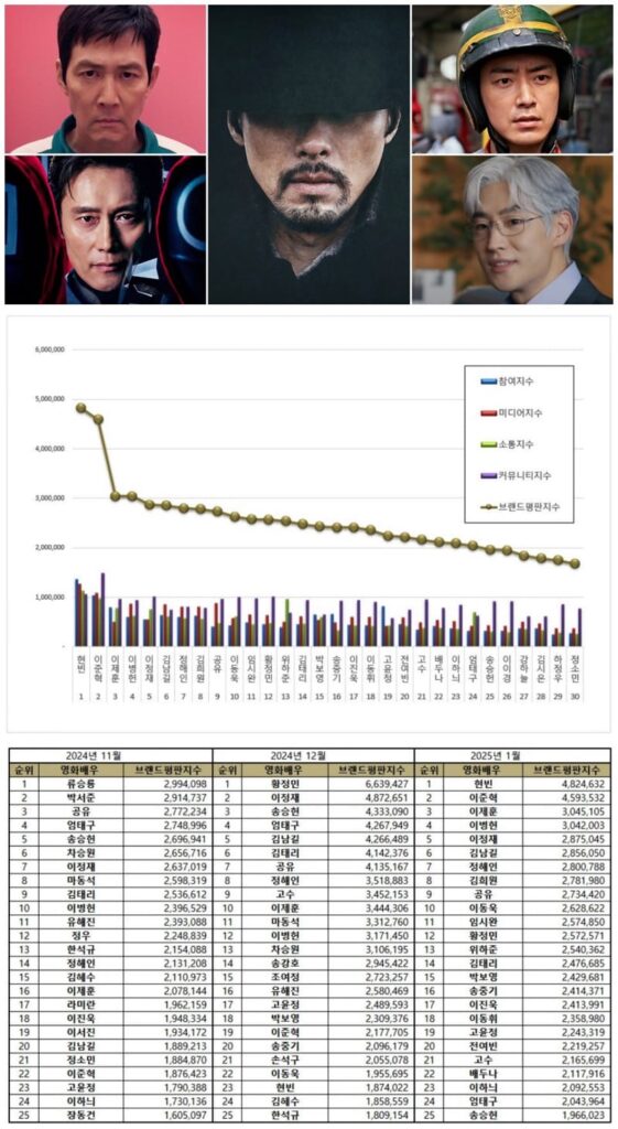 Lee Jung Jae, who made a comeback with the thrilling new season of “Squid Game,” ranked fifth, dropping from second place last December. Unfortunately, his brand value also decreased significantly by 41 percent, falling from 4,872,651 in December 2024 to 2,875,045 in January 2025, with the following breakdown: