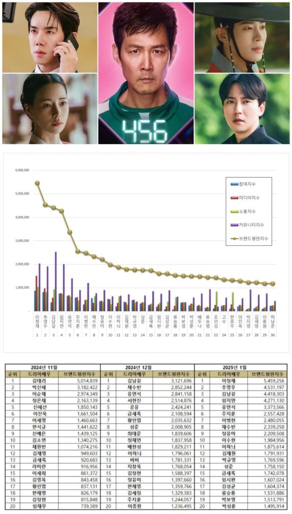 Actor Lee Jung Jae, who returns for another round of survival games in “Squid Game 2,” topped the drama actor rankings this January. The comeback star achieved an impressive brand value of 5,459,256, with the following breakdown: