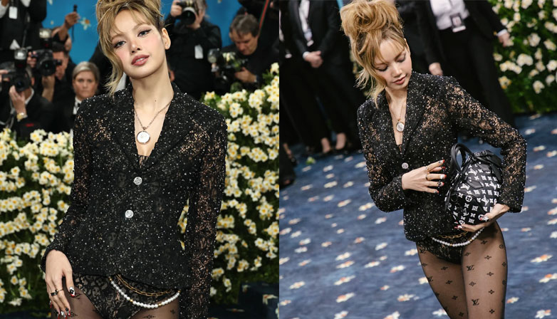 Then there was Lisa—making her official Met Gala debut in a sheer, no-pants Louis Vuitton outfit. Her bodysuit featured prints by Black artist Henry Taylor, including the portrait of Rosa Parks, strategically placed across the ensemble.