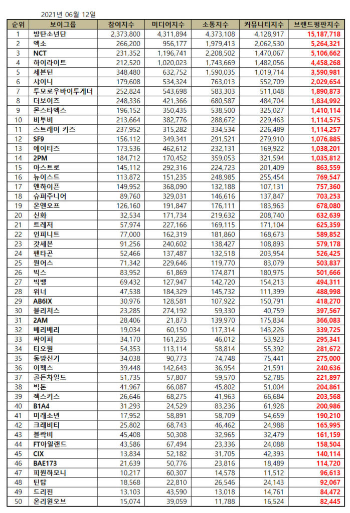 The Korea Institute of Corporate Reputation has gathered 59,599,283 big data of the K-pop boy group brands for the analysis. The data was taken from May 12, 2021, to June 12, 2021. Moreover, compared to the 51,242,292 big data of K-pop boy group brands in May, it increased by 16.31 percent.