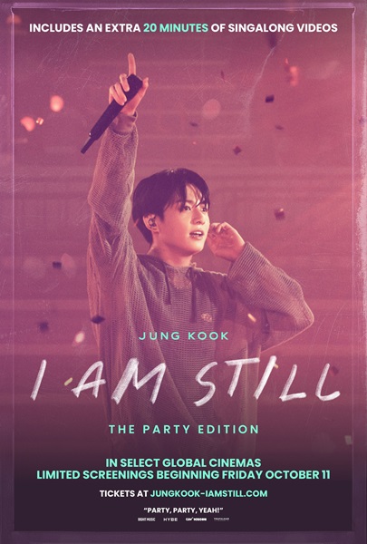 Following the immense success of its initial limited release, JUNG KOOK: I AM STILL has become an international sensation, capturing the hearts of BTS ARMYs around the globe. Now, fans have another reason to celebrate, as Trafalgar Releasing and HYBE announce JUNG KOOK: I AM STILL – THE PARTY EDITION, hitting select cinemas on October 11.