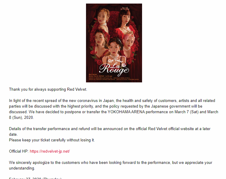 The Red Velvet girls have postponed their “La Rouge” concert tour in Yokohama, Japan, on March 7-8. Here is the announcement