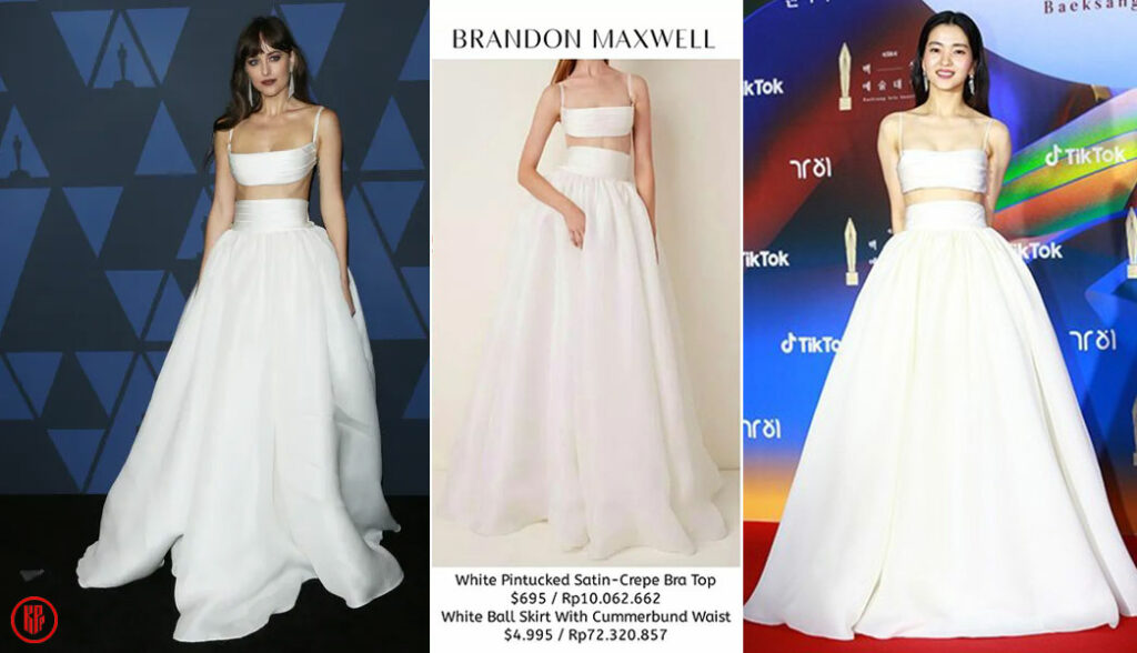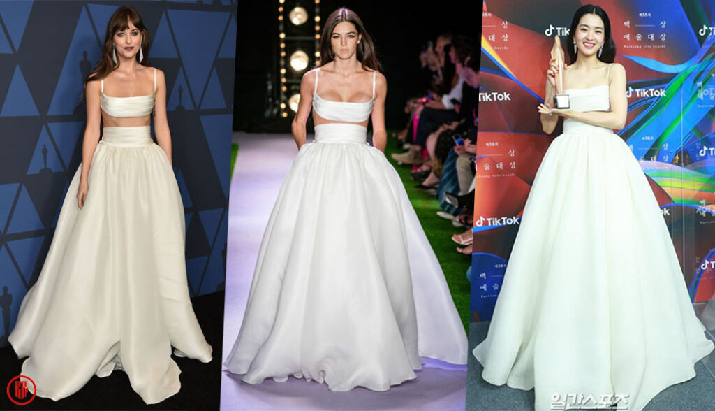 While both dresses seemed to be the same, there was a significant difference in the chest part of the dress. The Brandon Maxwell dress Dakota Johnson wore was more similar to the one on the fashion show. The front part of Dakota’s top was slightly slanted, while Kim Tae Ri’s was more fitting to her figure.